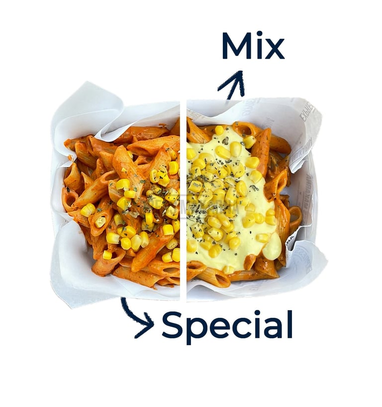 Kremalı domatesli özel reçeteli sos üzerinde, 3 peynirli sos, mısır ve fesleğen